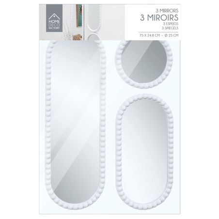 Lot de 3 miroirs blanc avec cadres modernes, dimensions variées : 75x25 cm, 50x25 cm, Ø25 cm, parfaits pour une décoration murale raffinée.