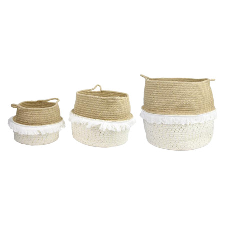 Lot de 3 Paniers Rétractables Cordage Coton Blanc Taupe et Doré avec Franges.