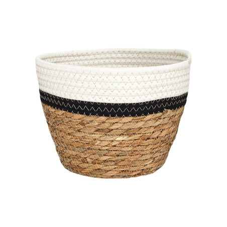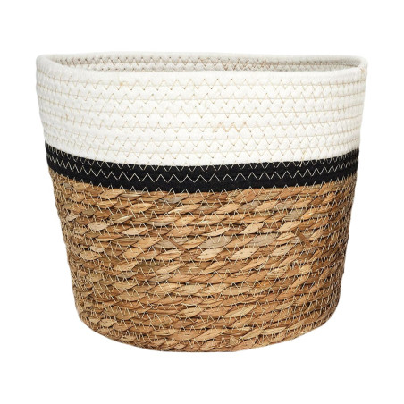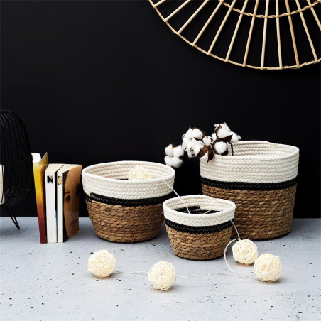 Lot de 3 Corbeilles Tressées en Jonc de Mer Naturel et Coton Noir et Blanc.