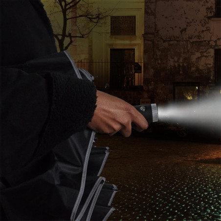 Contour du parapluie éclairé + lampe torche intégrée dans le manche.
