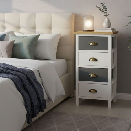 Meuble de Rangement 4 Tiroirs en Pin Teinté Gris et Blanc Plateau Naturel de la gamme Patty.