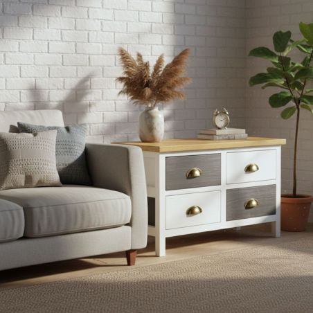 Meuble 4 Tiroirs en Pin Teinté Gris et Blanc Plateau Naturel de la gamme Patty.
