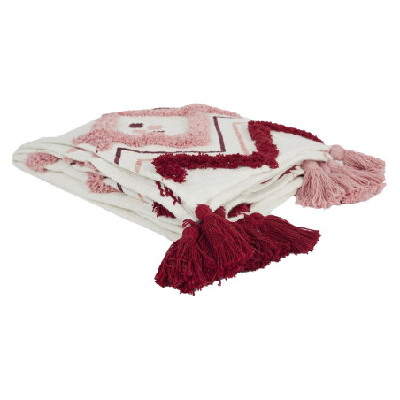 Plaid Jeté Ethnique Tufté 130x150cm Intérieur/Extérieur Coton Blanc et Rose avec Pompons.