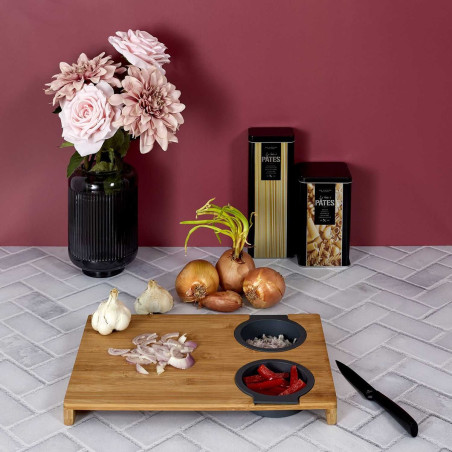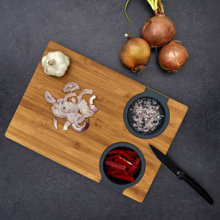 Cette planche à découper est le parfait 3-en-1 pour vous aider à cuisiner : elle présente un égouttoir et un récipient intégré.