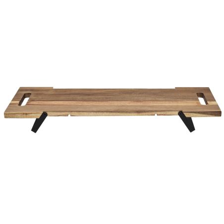 Planche de présentation en acacia sur pied en métal, idéale pour tapas et apéritifs.