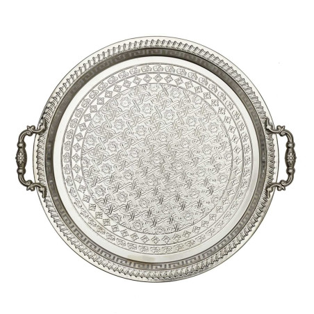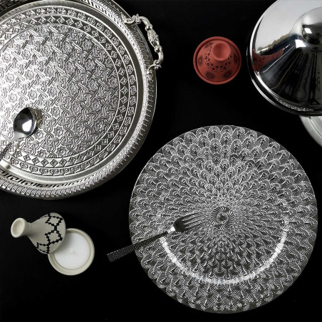Plateau incontournable au style oriental pour présenter de délicieuses préparations sucrées ou salées. Impressionnez vos convives grâce à ce plateau de service argenté !