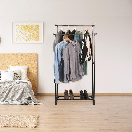 Portant Double sur Roulettes Hauteur Réglable Noir et Chrome.