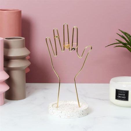 Design unique avec une main en métal pour suspendre vos bijoux, et un support terrazzo robuste et décoratif.