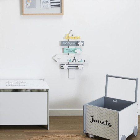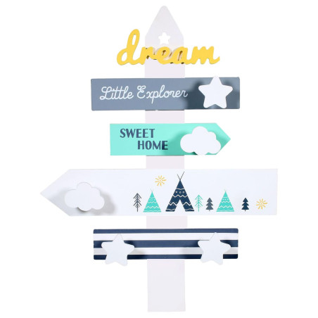 Porte-manteaux en MDF coloris blanc, panneaux directionnels à motifs coloris bleu gris jaune.
