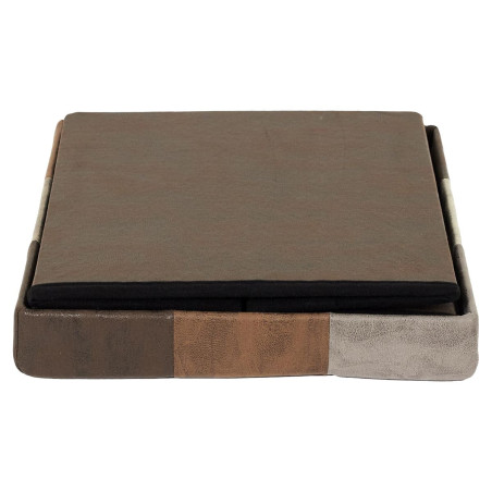 Structure en MDF, revêtement polyester aspect cuir motif patchwork, rembourrage mousse polyuréthane densité 25kg/m3.