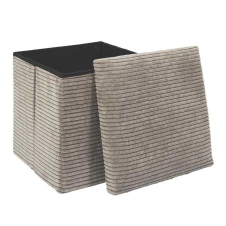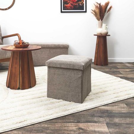 Pouf Coffre Pliable Côtelé Taupe 38x38 cm de la gamme Amory. Un meuble polyvalent qui combine à la fois rangement pratique et assise confortable, idéal pour le salon ou la chambre.