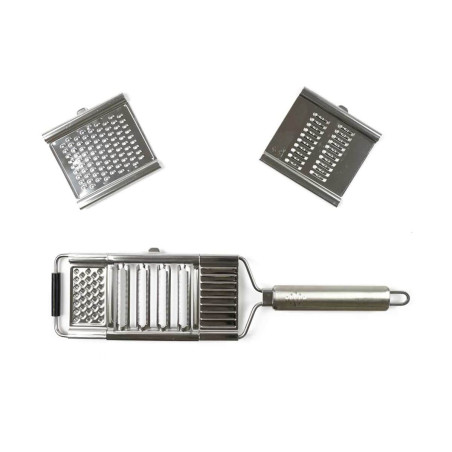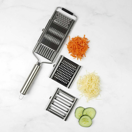 Le grand classique de la râpe manuelle avec 3 lames de coupes différentes à clipser suivant les besoins.