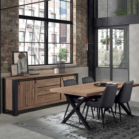 Ensemble Buffet et Table 170 cm Aspect Bois Finition Scarlet Piètement X Métal Noir de la gamme Clodius.