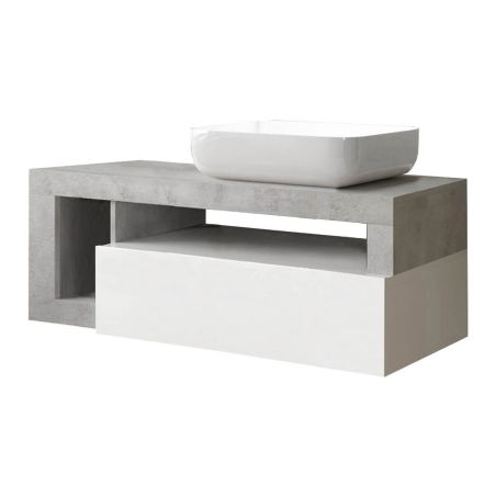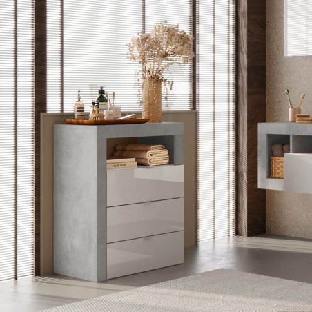 Conçu en panneaux de particules haute densité. Revêtement mélaminé laqué blanc aspect béton de première qualité. Eclairage miroir inclus.