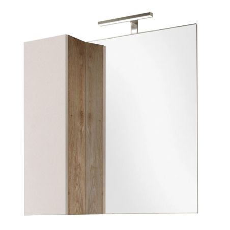 Conçu en panneaux de particules haute densité. Revêtement mélaminé laqué beige aspect bois de première qualité. Eclairage miroir inclus.