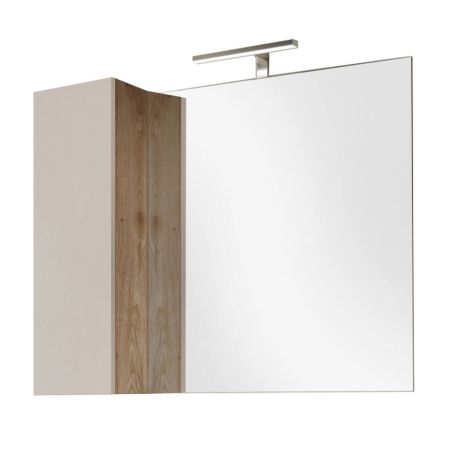 Conçu en panneaux de particules haute densité. Revêtement mélaminé laqué beige aspect bois de première qualité. Eclairage miroir inclus.