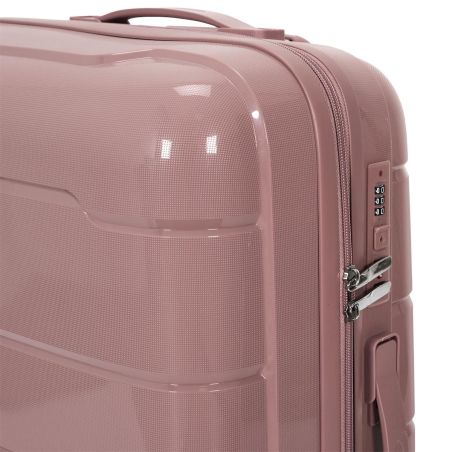 Valises en polypropylène avec design chic et moderne, équipées de roues pivotantes à 360°, poignée de traction et cadenas sécurisé à code.