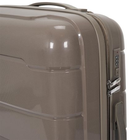 Valises en polypropylène avec design chic et moderne, équipées de roues pivotantes à 360°, poignée de traction et cadenas sécurisé à code.