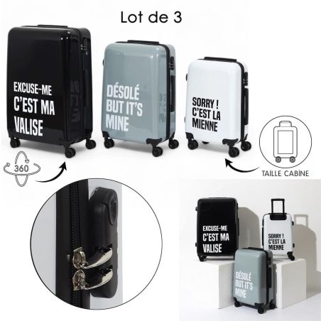 Lot de 3 Valises mots Noire, Grises, Blanche avec Roues Pivotantes 360° et Cadenas Sécurisé à Code.