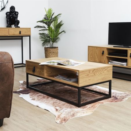 Avec son style industriel élégant, cette table basse sera sûre de faire mouche dans votre salon. En plus de son piétement en métal, son plateau est équipé d'un tiroir de rangement et d'une niche ouverte pour un encombrement minimal.