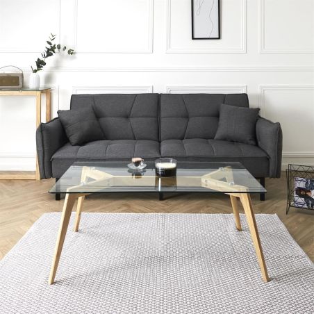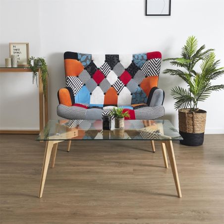 Le choix d'un plateau en verre combiné à un piétement en bois massif donne à cette table un aspect design se mariant sans soucis avec un grand nombre d'intérieurs. Plateau transparent monté sur 4 pieds.