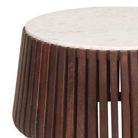 Table Basse en Marbre Blanc et Socle en Manguier Teinté Noyer de la gamme Holden.