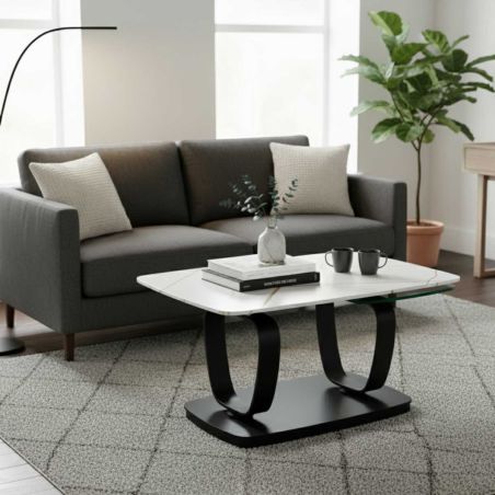Table Basse Plateaux Céramique Effet Marbré Blanc Amovible et Verre Fumé de la gamme Vassili.