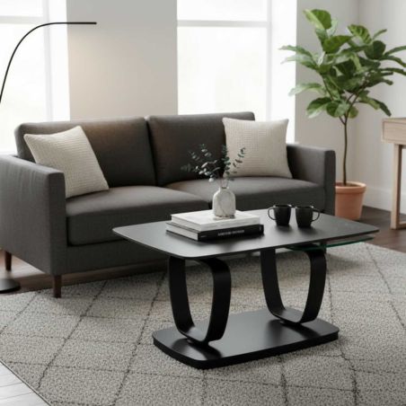 Table Basse Plateaux Céramique Effet Marbré Noir Amovible et Verre Fumé de la gamme Vassili.