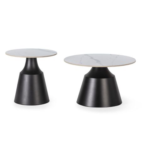 Ensemble de 2 tables basses plateaux céramique imitation marbre blanc pied central en métal - REYLI.