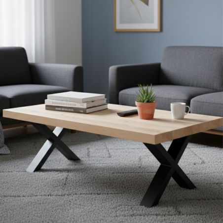 Une table basse aux lignes contemporaines pour tous les intérieurs avec une piètement métal en X.