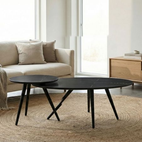 Lot de 2 tables basses plateau MDF placage céramique noir marbré piètement métal - SHADOW.