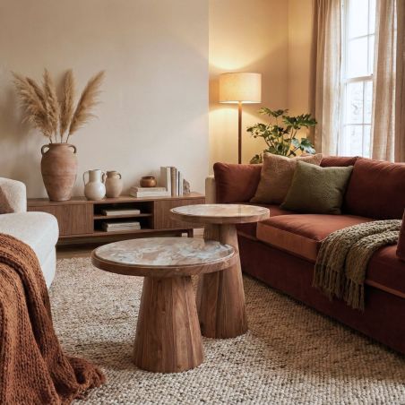 L'ensemble de tables basses est une véritable déclaration de style, conçu pour apporter une touche d'élégance naturelle et de luxe discret à votre salon. Ces tables combinent des formes organiques inspirées de la nature et des matériaux intemporels.