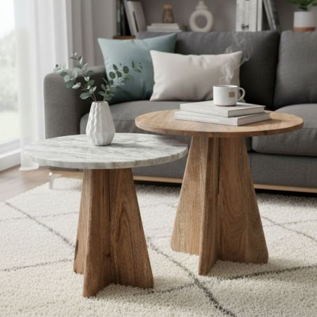Lot 2 de tables basses rondes plateaux acacia et marbre pieds centraux en acacia - OASIS.