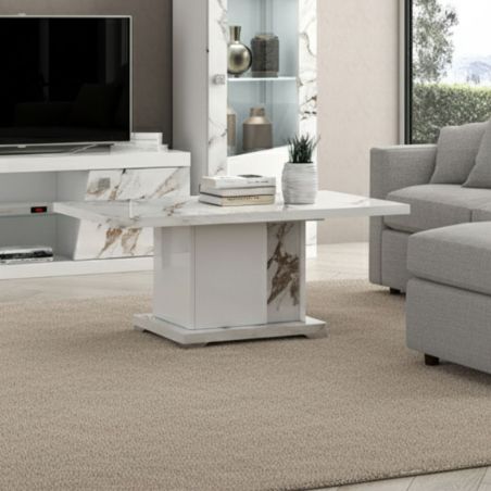 Table basse 120x65cm pied central laqué blanc et imitation marbre - ETOLIS.