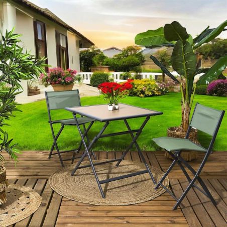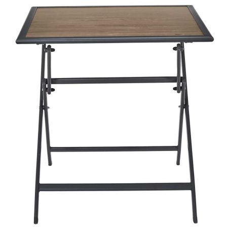 Table pliante métal laqué gris et plateau en verre trempé effet bois de la gamme Bahiana.