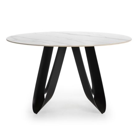 Table de repas design Ø 134 cm avec plateau céramique imitation marbre blanc pied métal noir architectural - LEILA.