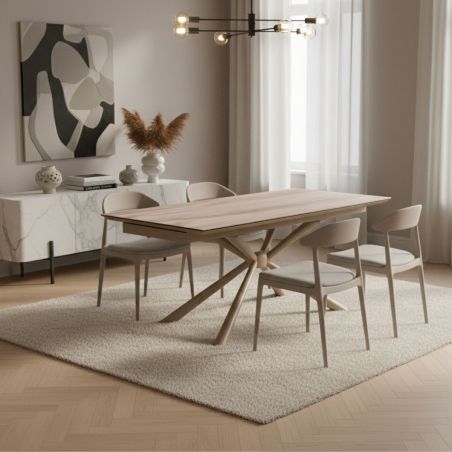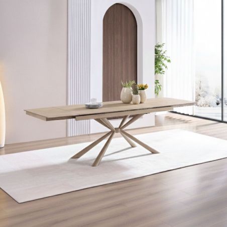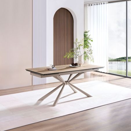 Table repas 180x90cm allongeable plateau en verre et céramique finition chêne pied étoile métal laqué sable - ECLIPSE.