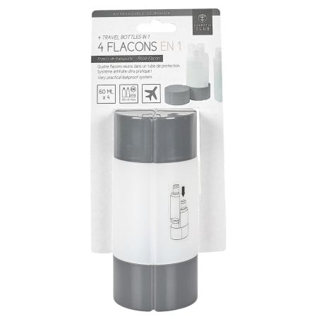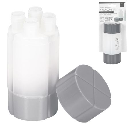 Emportez vos indispensables cosmétiques (shampoing, gel douche, lotion, etc.) partout avec vous grâce à ces 4 flacons de transport réunis dans leur tube de protection !