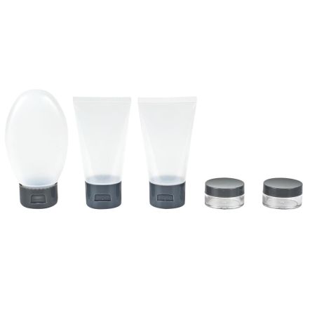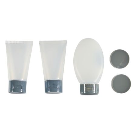 Kit de voyage avec 3 flacons et 2 pots (12ML à 100ML) en plastique blanc + Pochette transparente.