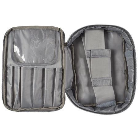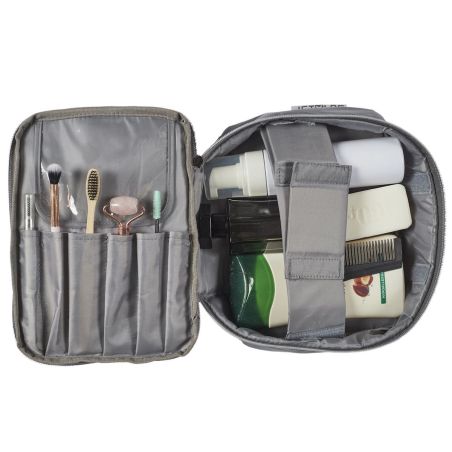 Trousse de toilette cosmétique rectangulaire 19x26cm en polyestère gris avec ses séparations amovibles.