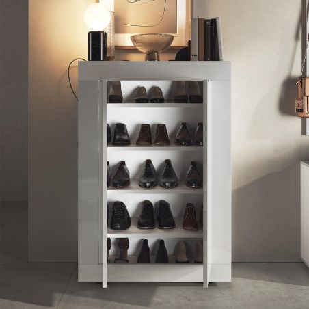 Meuble d'entrée 2 portes 4 étagères Blanc Laqué Weiss - OTELLO.