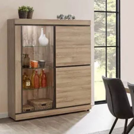 Une vitrine très élégante grâce à sa partie vitrée éclairée, protégeant 3 tablettes en verre. Ses deux portes droites quant à elles dissimulent 3 étagères.
