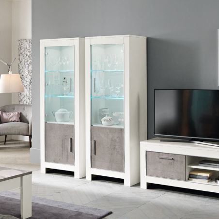 Vitrine Droite Laquée Blanc Brillant et Gris Marbré avec Leds de la gamme Denae. Une collection italienne de qualité pour moderniser et donner du cachet à votre intérieur.
