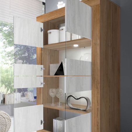Vitrine 4 portes aspect bois finition Mercure façades blanc texturées et verre avec Leds - OTELLO.