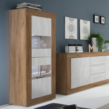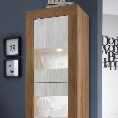 Vitrine 2 portes aspect bois finition Mercure façades blanc texturées et verre avec Leds - OTELLO.