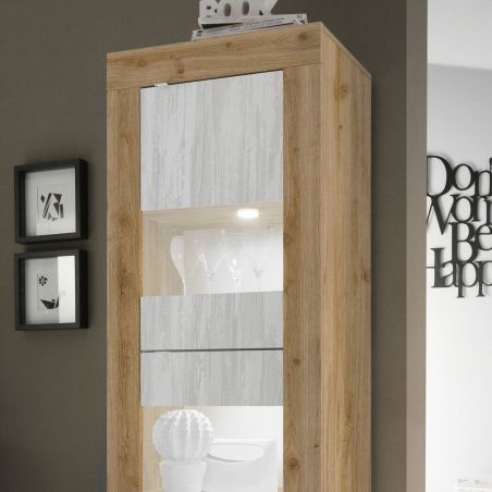 Vitrine 2 portes aspect bois finition Cadiz façades blanc texturées et verre avec Leds - OTELLO.